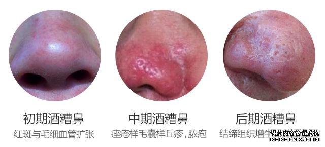 1、红斑期:酒糟鼻最开始的症状为短暂性红斑,主要特点是皮肤发红。在脸的中部、两颊、眉间、特别是鼻子会出现红斑,并且两侧对称出现,红斑最初只是偶尔会出现,比如吃了辛辣刺激食物或喝热饮料时、外界环境的温度升高时、感情冲动时面部可能发红并且充血,自己感觉发烫。之后会不同程度的反复发作,时间长了红斑会持续不退,鼻尖、鼻翼及面颊的地方可看到扩大后的毛细血管,而且脸中部发红并且持久,看起来也是油光光的,毛孔比较粗大。