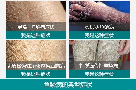 此病主要症状为四肢伸侧或躯干部皮肤干燥、粗糙,伴有菱形或多角形鳞屑,外观如鱼鳞状或蛇皮状。临床上根据鱼鳞病的症状表现,遗传方式,发病时间等将鱼鳞病分为四种类型,各型鱼鳞病症状有区别。
